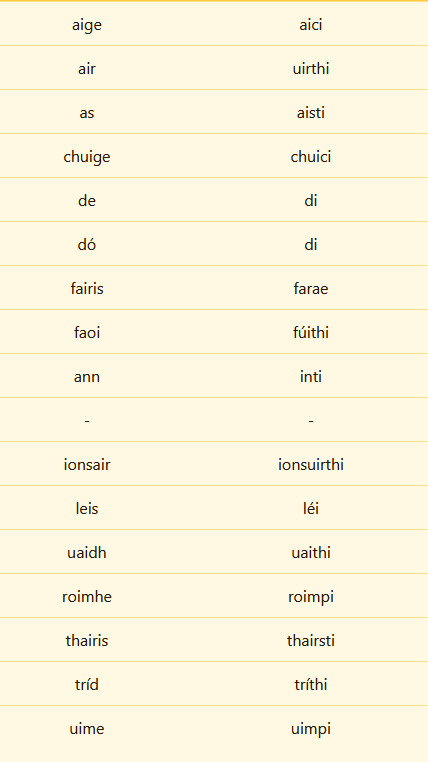 Subject: sí, object: í, possessive: a (h-prefixes, no lenition), ag: aici, ar: uirthi, as: aisti, le: léi…