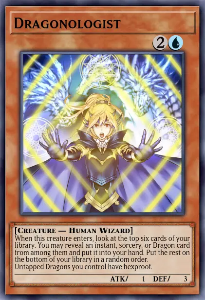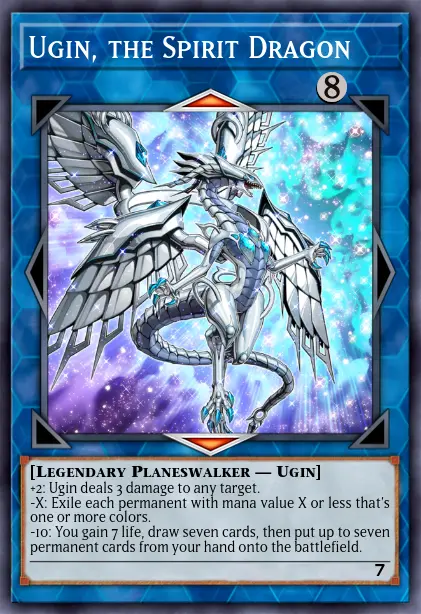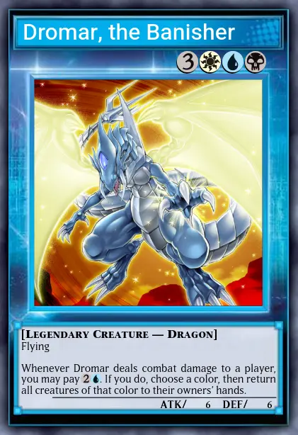This Reddit post outlined a basic idea for a deck with Dromar, the Banisher as a commander and other themes that were identified for the deck where: dragons, machine monsters, lads with big axes and the words “raider” or ”kaiser” in their names and big flashy trap cards that fuck up the opponent’s deck because this is first a comic about card games with big dramatic reversals and second a an actual card game. As well as Dromar repping the mandatory Blue-Eyes White Dragon I was keen on having some representation of some other cards I always associate with Kaiba like Crush Card Virus, Lord of D. and XYZ‑Dragon Cannon. I also wanted to have at least a few cards that functioned similar to trap cards or flip effect monsters from Yu‑Gi‑Oh!