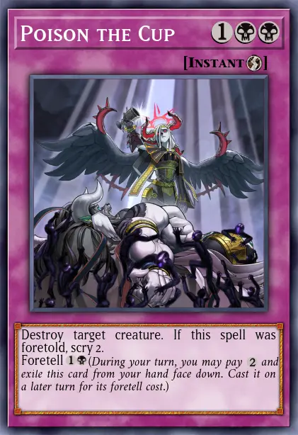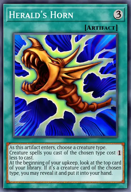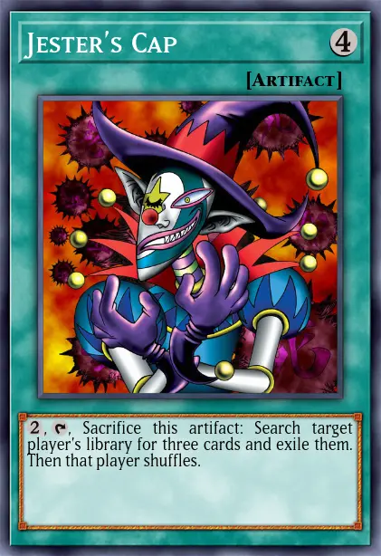 Jester’s Cap combines the Crush Card Virus and Saggi the Dark Clown, which Kaiba often used together. I originally used the trap card layout for this but decided to save that just for cards with foretell, as those are going to be the ones played face down and settled on leaving artefacts as normal spell cards.