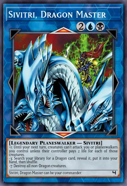 I am playing with revising the deck with Sivitri as commander rather than Dromar. This means no more but that was the least-used colour in the deck anyway and of the custom proxies I made it only loses Smothering Tithe. Caoimhe has objected that “a little bit of white mana is useful for Kaiba to be portrayed as not entirely evil,” but on the other hand, nah.