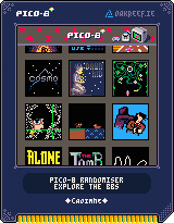 Pico-8 BBS randomiser View source code View source code August 2018 Categories: Pico-8, misc A small Pico-8 cart that downloads random carts from the Pico-8 BBS.
